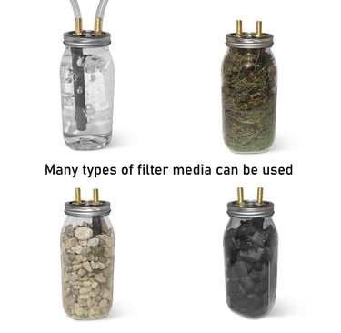This filter can use many different types of filter media for different purposes. The most simple of the filter media is water, which can be used as a filter media for wood gas or syn gas production (fill the filter 90% of the way with water for this application). After the gas is produced and cooled, it can then travel through this filter in order to extract most of the ash, oils, creosote, and other contaminants before heading on to storage or immediate use. If a gas production system is used in freezing temperatures, or for various other applications, filter media such as sand, gravel, wood shavings, charcoal, grass clippings, and many other media options can be used.