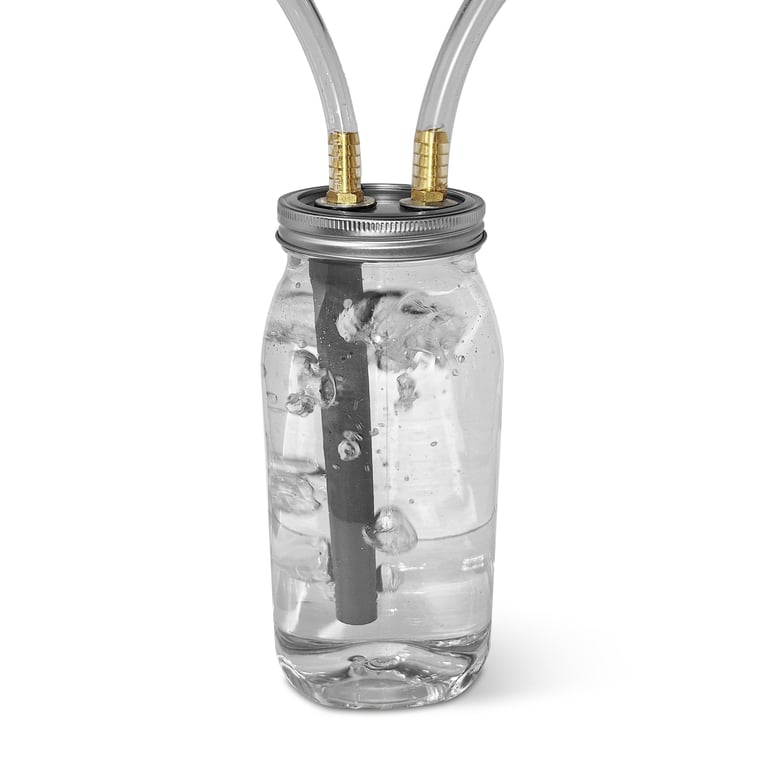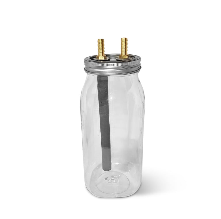 - Off the shelf container (64oz wide mouth plastic jar), easily replaceable if needed
