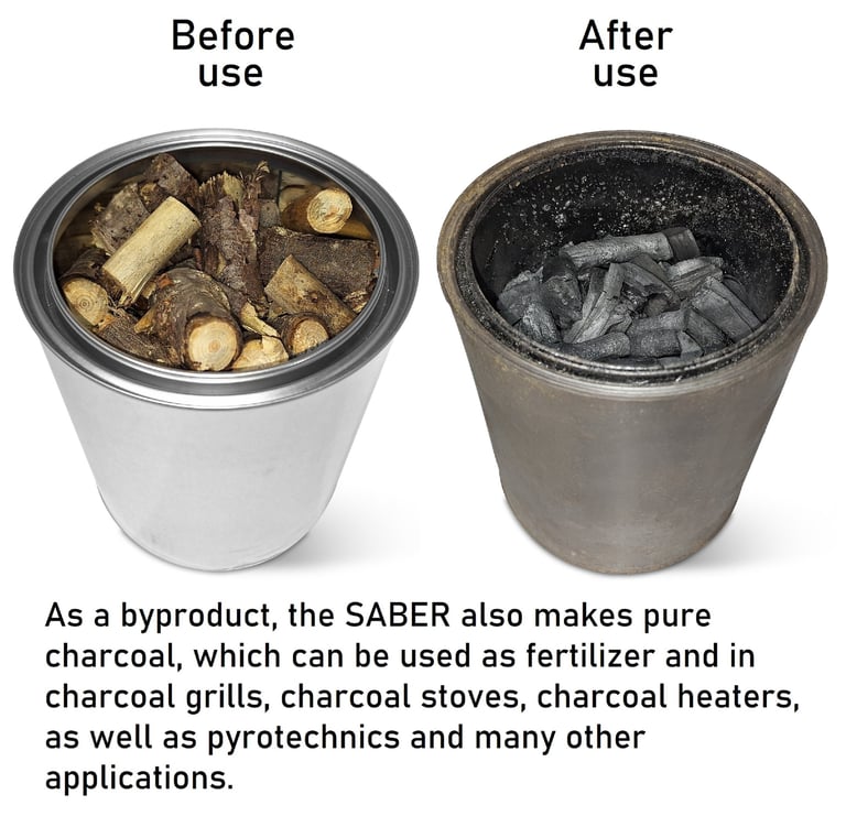 The other byproduct the SABER produces at the same time is pure charcoal, which can be used in charcoal grills, charcoal stoves, fertilizers, pyrotechnics, and can even be used to create even more gas.